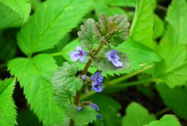 Die kleine Braunelle (Prunella vulgaris) ist für den Menschen zwar unscheinbar, aber als langzeitblühende Wildblume wichtiges Nahrungsmittel für viele Wildbienen (©pixabay). Den im Landkreis auch weit verbreiteten und häufig vorkommenden Wiesenpflanzen Gundermann (Glechoma hederacea, mitte) und Kriechender Günsel (Ajuga reptans, rechts) sieht die kleine Braunelle (links) recht ähnlich, man kann sie aber gut durch ihre bräunlichen Kelchblätter unterscheiden (©pixabay).