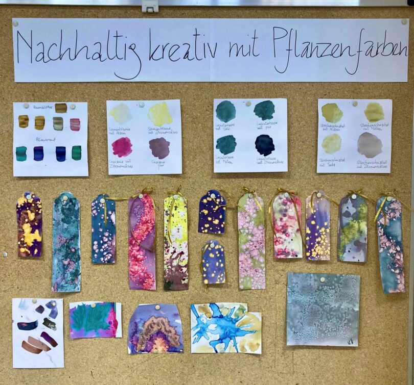 Eine weitere Klasse hatte große Freude an praktischer Naturschutzarbeit und war mit einem Biosphären-Ranger am Thann berg unterwegs. Eine 11. Klasse hat sich dem Thema Natur auf künstlerische Weise genähert und unter Anleitung mit Pflanzen Lesezeichen kreativ gefärbt.
