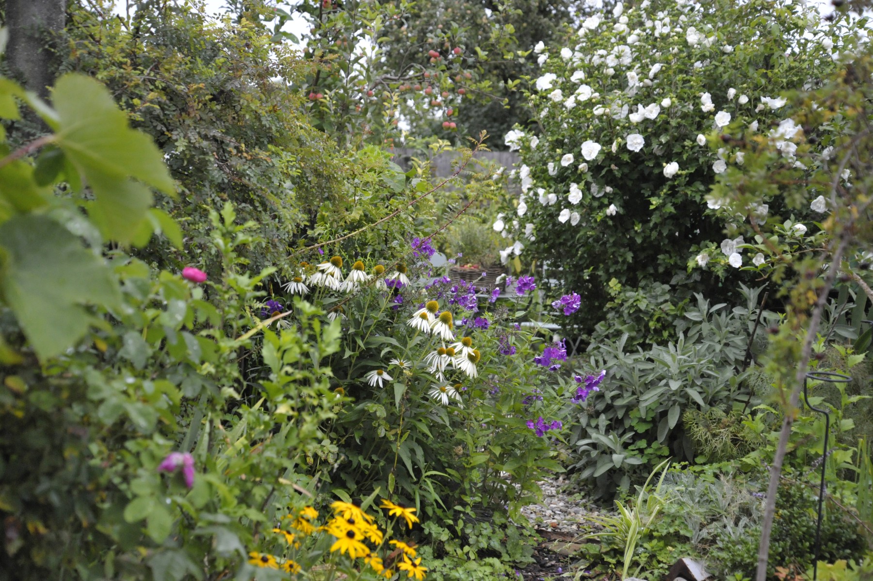 Naturnaher Garten mit Salbei, Sonnenhut, Phlox, einer Wildrose und einem Apfelbaum im Hintergrund.