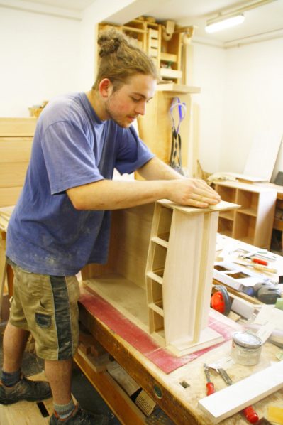 Das Spektrum der Abschlussarbeiten der Schreiner umfasst Vitrinen, Kleiderschränke, Tische und Schreibtische. Diese Arbeiten fertigen die Schüler nach eigenen Entwürfen.