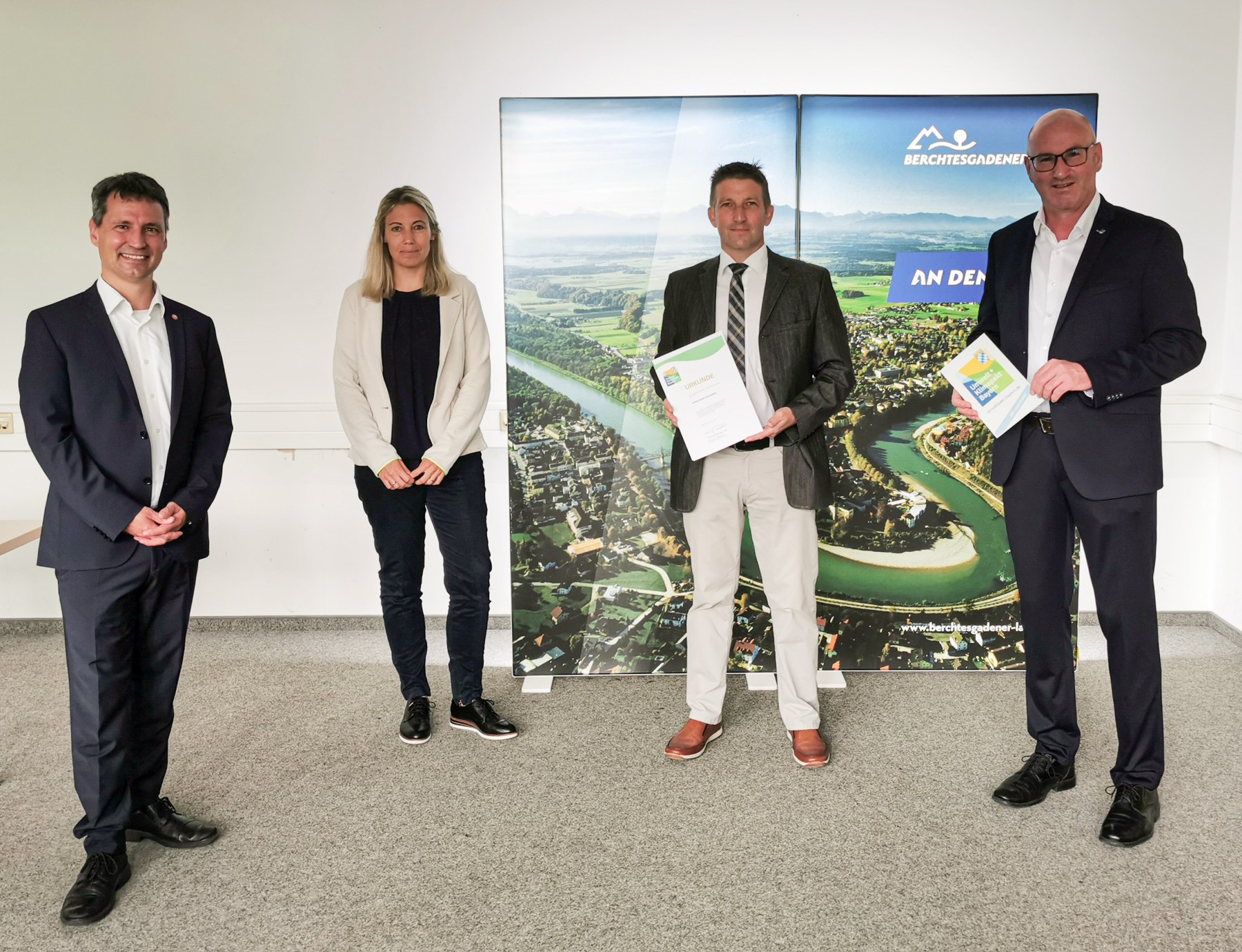 Alfred Huber Immobilien: Freilassings Erster Bürgermeister Markus Hiebl, BGLW-Geschäftsführerin Dr. Anja Friedrich-Hussong, Geschäftsführer Alfred Huber und Landrat Bernhard Kern bei der Übergabe der Urkunde „Teilnehmer am Umweltpakt Bayern“.
