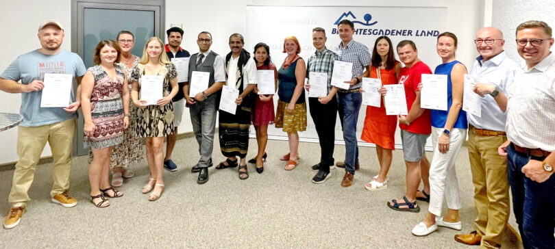 Bericht und Foto: LRA BGL – Die neu zertifizierten LaiendolmetscherInnen mit Verena Seel, Ehrenamtskoordinatorin der Caritas (2.v. l.), Integrationslotsin Astrid Kaeswurm (3. v. l.), Ausbilderin Antje Bommel (9.v.l.) und dem Stellvertreter des Landrats Michael Koller (r.)