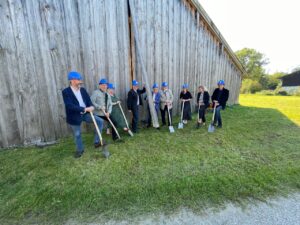 Spatenstich (von links nach rechts): Architekt Prof. Florian Nagler, Bürgermeister Konrad Linner, Bezirksrätin Barbara Kuhn, Museumsreferent Bezirksrat Thomas Schwarzenberger, Bezirkstagspräsident Josef Mederer, Bezirksrat und 1. Vorsitzender Förderverein Sebastian Friesinger, Museumsleiterin Dr. Claudia Richartz, Museumsdirektorin Dr. Julia Schulte to Bühne, Baudirektor Christoph Schreyer © Bezirk Oberbayern, Bauernhausmuseum Amerang.