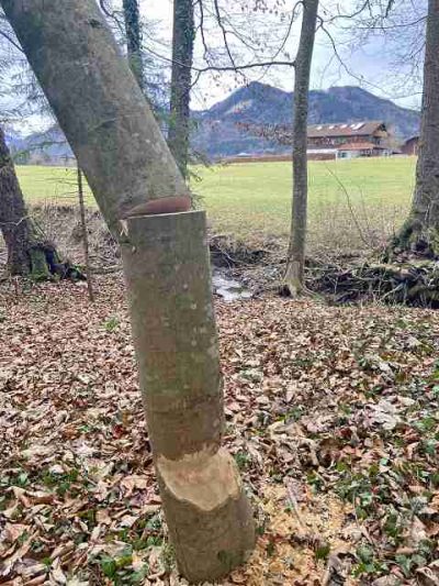 An einem Baum zweierlei Arten von Baumfällungs-Methoden zu finden, das ist eher eine Seltenheit. Zu finden ist dies im kleinen Ort Weiher bei Aschau i. Chiemgau. Dort im Priental sind nicht nur Holzarbeiter, sondern auch der Biber zu Gange, so dass sich diese Bilder ergeben.