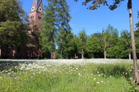Erwin Schärfl: Das Team der Gärtnerinnen und Gärtner machen beim Mähen einen großen Bogen um die Margeriten herum. Solange sie blühen, werden sie nicht gemäht. Bis in den Herbst hinein sorgen Blumen auf dem Gelände dafür, dass unsere Bienen reichlich Nahrung finden. So blüht es an allen Ecken und Enden des Klinikums.