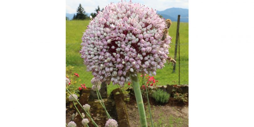 Bei solch einem Angebot kann keine Biene widerstehen. Eifrig werden die Blüten der großen Zwiebeln im Garten nach dem Nektar abgesucht und mit viel Ertrag geht es zurück in den heimischen Stock.