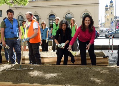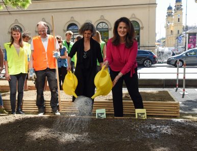 Die Grünflächen vor dem Landwirtschaftsministerium in der Münchner Innenstadt sollen sich in den nächsten Wochen in ein buntblühendes Eldorado für Bienen und andere Insekten verwandeln. Dafür startete Landwirtschaftsministerin Michaela Kaniber am heutigen Dienstag das Projekt “Urbeen”, eine Gemeinschaftsaktion mit dem Lehrstuhl für Landschaftsarchitektur der TU München. “Wir wollen ein Stück Natur und Landwirtschaft mitten in die Stadt holen und für alle erlebbar machen”, sagte Kaniber. Gemeinsam mit Prof. Regine Keller und ihren Studenten säte sie die ersten Bienenweiden und sorgte gleich selbst für die dringend nötige Bewässerung. 25 Studentinnen und Studenten hatten die Grünflächen des Ministeriums zuvor zu einem interessanten Ensemble aus Feldern, Wegen und riesigen Insektenhotels umgestaltet. Wer sich das anschauen möchte: Das Landwirtschaftsministerium ist in der Ludwigstr. 2.