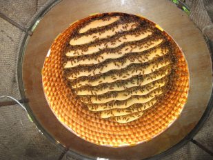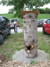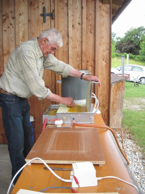 Viele Besucher der Einweihungsfeierlichkeit nutzten die Gelegenheit, die auf die Bedürfnisse der Imker und auf die umweltpädagogischen Angebote abgestimmten Räume des Schaubienenhauses und die gesamte in das Umfeld des Hilgerhofs eingebettete Anlage zu besichtigen und bei den Vorführungen im Rahmen des „Tages der Imkerei“ die vielfältigen Aufgaben des Imkers kennenzulernen. Zur Honiggewinnung wird das Hilgerhof-Bienenhaus zwar mit einer modernen motorisierten Honigschleuder ausgestattet; damit man den Vorgang aber besser erkennen kann, wurde an diesem Tag jedoch eine traditionelle mit Handkurbel betriebene Schleuder in Gang gesetzt und jeder konnte den aus dem Hahn fließenden frischen Honig probieren. Interessant war auch, wie der Imker aus dem Wachs seiner Bienen Wachsplatten fertigt – in der Imkerfachsprache Mittelwände genannt – und sie durch Anschmelzen in die Rähmchen einpasst, die in die Kästen für die Bienen eingehängt werden, damit die Bienen schön regelmäßig daran weiterbauen. An diesem Tag am Hilgerhof konnte aber auch beobachtet werden, wie die Bienen in den früher üblichen Bienenkörben nach eigenem Muster ihre Waben bauen – ein Bienenkorb stand an der Spitze eines kleinen Zeltes, zum Zeltinnern hin durch eine Glasscheibe abgedeckt, so dass man von unten das Bienenvolk über sich betrachten konnte. Noch ursprünglicher war der Wildbau eines Bienenschwarms in einem hohlen Stamm, auf den die Obing-Pittenarter Imker von der Familie Leitner aus Emertsham aufmerksam gemacht worden waren (wir berichteten). Der Stamm hat jetzt auf dem Parkplatz beim Schaubienenhaus seinen Platz gefunden. Im Ausstellungsraum der Hilgerhof-Galerie konnte man künstlerische Darstellungen unterschiedlicher Art zum Objekt Bienen und ihr Umfeld bewundern.