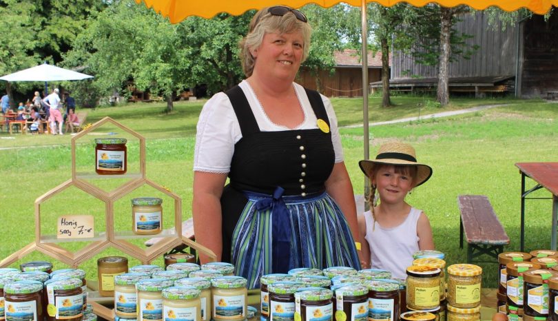 Auf den Wiesen des Bauernhausmuseums informierte der Imker Kreisverband Rosenheim e.V. die Besucher über die Bedeutung der Bienen und die Produkte, die wir ihnen verdanken. Die Kreisvorsitzende Angela Sollinger hatte auf zwei Ständen eine reiche Auswahl von Produkten: Sie reichten von verschiedenen Honigsorten, über Pollen, Kerzen aus Bienenwachs, Propoliscreme bis hin zum köstlichen Met. Imkerei ist eine Leidenschaft! Davon ist Angela Sollinger überzeugt. „Die Imkerei wird auch immer beliebter. Wir haben in Stadt und Landkreis Rosenheim inzwischen 1.400 Imker. Und es werden ständig mehr. Besonders jüngere Männer und Frauen und Rentner entdecken die Imkerei für sich.“ Einen Bienenstock kaufen und loslegen – so geht es freilich nicht. „Wer Imker werden will, sollte ein Jahr lang Schulungen machen. Wir bieten hier Patenschaften an und kümmern uns intensiv um die Neulinge, damit es mit den Bienen dann auch klappt.“ Es gibt neun Lehrbienenstände im Landkreis Rosenheim, der neueste wird am 1. Juli in Großkarolinenfeld eingeweiht.