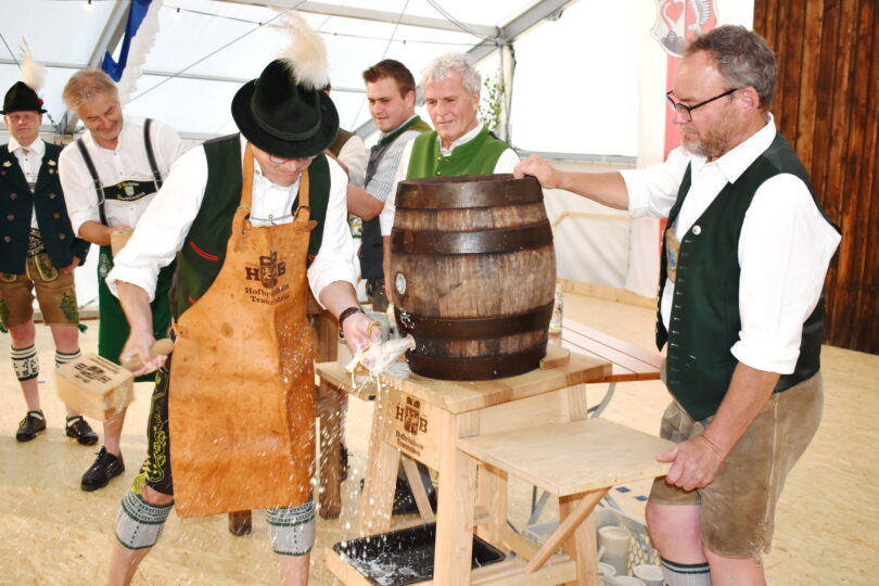 Synchron mit zwei Fässern wurde das 105-jährige Gründungsfest des Trachtenvereins GTEV „Seerose“ Seebruck eröffnet. Bürgermeister Martin Bartlweber und sein Stellvertreter Norbert Maier zapften die Fässer der Brauereien, dem Hofbräuhaus Traunstein und der Klosterbrauerei Baumburg im Gleichklang an. Nach den vier Schlägen von Bartlweber hieß es von ihm: „O´zapft is! Auf ein friedliches Trachtenfest!“ Das war der Startschuss zu den fünf Tagen der Feierlichkeiten und dem Gemeindejubiläum am kommenden Montag, 23. Juni zum Abschluss.