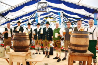 Nach dem erfolgreichen Anzapfen gab es das erste „Prosit“ in der Runde: von links: Alex Beer (Hofbräuhaus), 2. Vorstand Georg Hölzl, Bürgermeister Martin Bartlweber, Festleiter Seppi Mayer, Vorstand Anton Mayer, Rudi Lutz (Hofbräuhaus), Maxi Schneider, Dominik Tapper (beide Baumburger) und 2. Bürgermeister Norbert Maier.