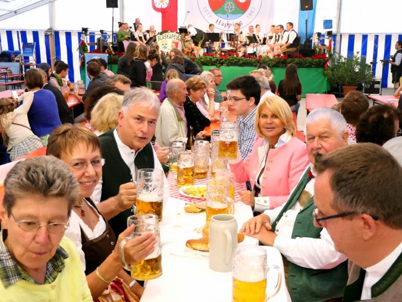 Das Jubiläumsfest anlässlich der 1000jahrfeier und 50 Jahre Eingemeindung zur Stadt Rosenheim hat durch den trationellen Bieranstistich im Festzelt Happing begonnen. Der dritten Bürgermeisterin der Stadt Rosenheim, Frau Dr. Beate Burkl gelang es nach vier Schlägen das Fass anzuzapfen und eröffnete damit die Happinger Festtage. Für die musikalische Umrahmung des Abends sorgte die Blaskapelle am Wasen. Tänzerische Einlagen und Plattler wurden von der Jugend- und Aktivengruppe des Trachtenverein “Kaltentaler” Pang wie auch von den Panger Goasslschnoizer dargeboten. Auch fand die Preisverleihung des Stadtteilschießen statt. Neben dem süffigen Flötzinger Bräu gab es noch Deftiges aus der Küche vom Küchenwirt des Landgasthofes Hotel Happinger Hof Martin Kupferschmidt.