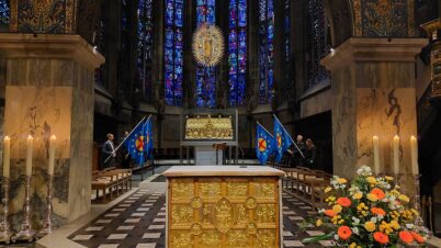 20250518_095910 … HK.jpg: Paneuropa-Fahnen am Schrein Karls des Großen.
