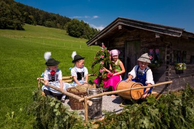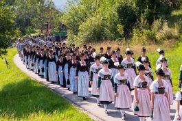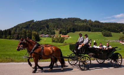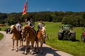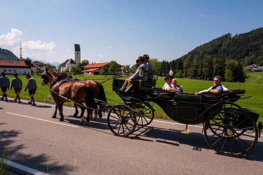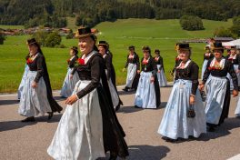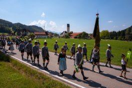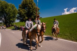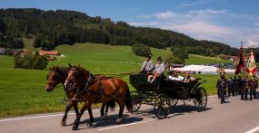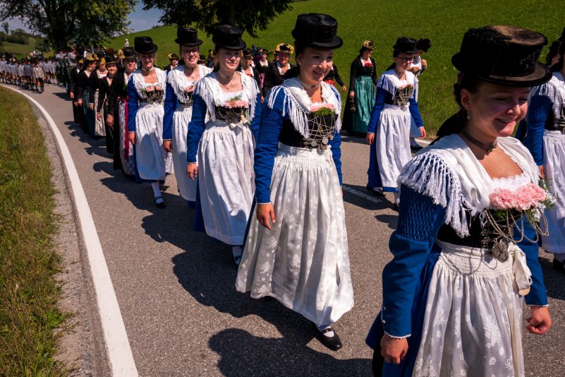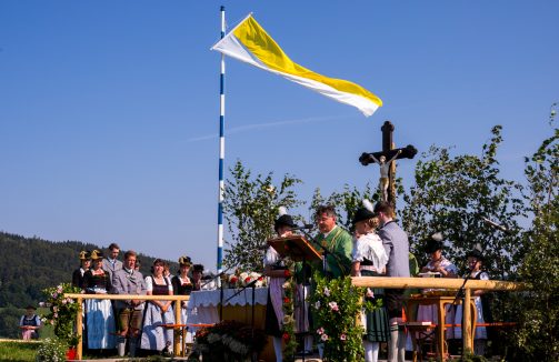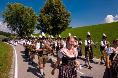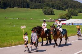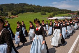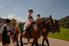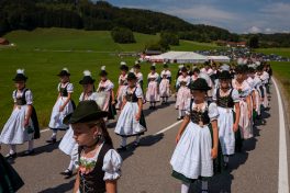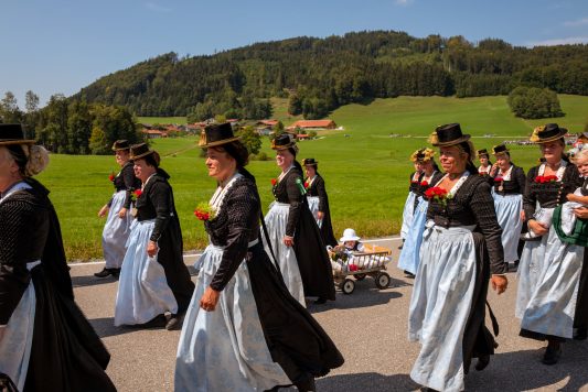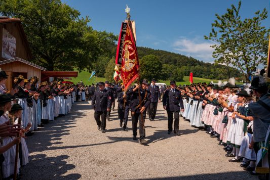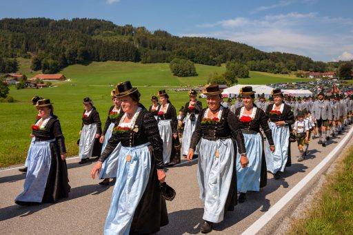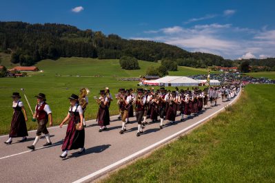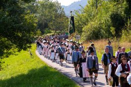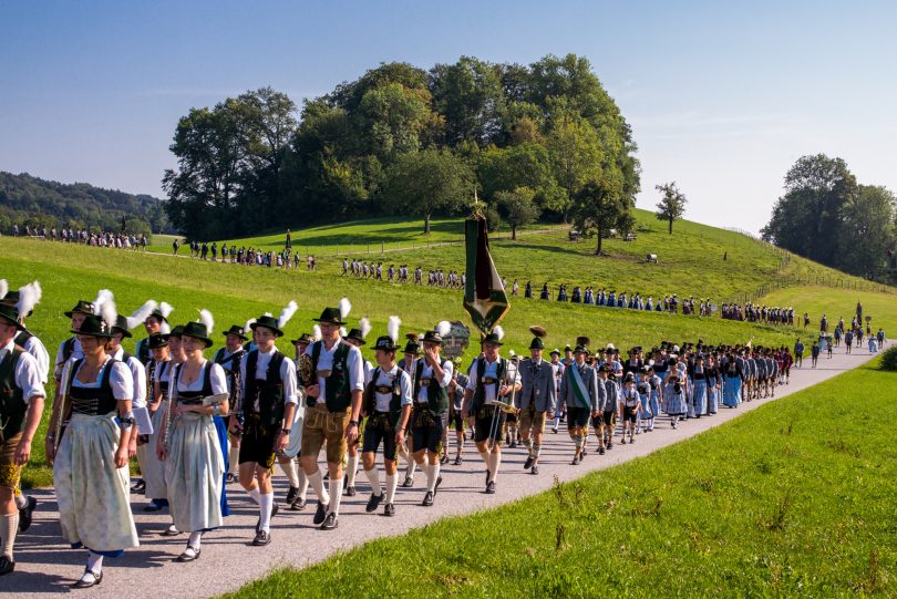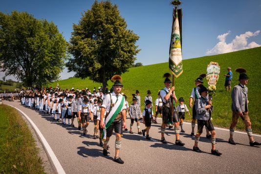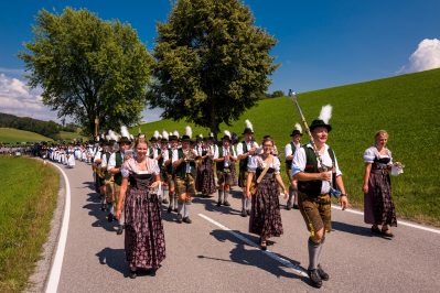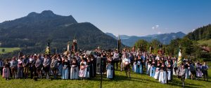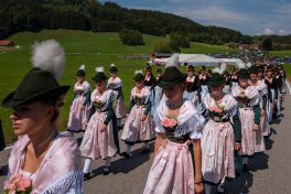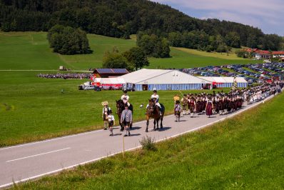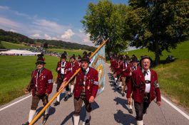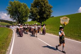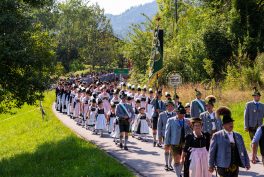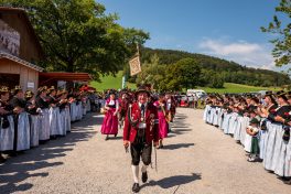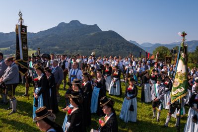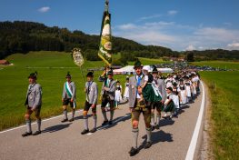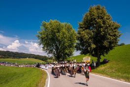 Schönstes Sommerwetter begünstigte bislang alle Feierlichkeiten zum 120jährigen Jubiläum vom Trachtenverein Almenrausch Rossholzen am Samerberg – und so war es auch am Festsonntag, als sich in sechs Zügen eine überaus große Trachtlerschar vom Festzelt zum Gottesdienst oberhalb des Badwirtes in Bewegung setzte. Angeführt wurde der Festzug vom Leonhardiverein Rossholzen und dessen Vorreitern sowie von der Festmusikkapelle Samerberg unter der Leitung von Benedikt Paul.