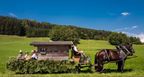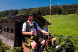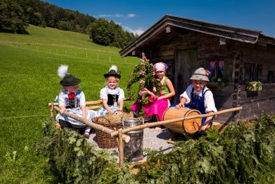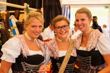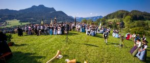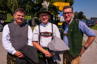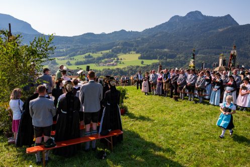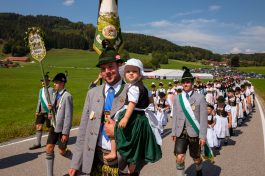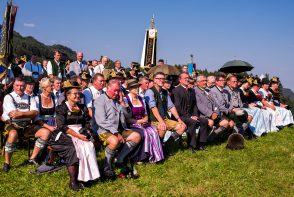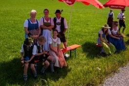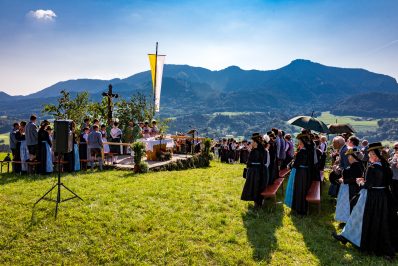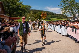 120 Jahre Trachtenverein Rossholzen wurden nicht nur an einem Tag und von einem Verein alleine gefeiert. Im Gegenteil: ein Großteil der rund 320 Vereinsmitglieder, viele Einwohner vom Samerberg und ganz besonders der Festverein haben sich fast zwei Jahre angestrengt, um das Fest genau und gut hinzukriegen. Dies ist ihnen bestens gelungen, zumal sie wertvolle Unterstützung von Festwirt Wolfgang Kirner und von der Brauerei Flötzinger erhielten. „Doch das allein war es nicht, es war auch das Fest der Parkplatzeinweiser, der Kuchenbäckerinnen, der Ton-Techniker sowie der vielen weiteren fleißigen und leisen Helferinnen und Helfer“, so Vorstand Martin Schober, der selbst mit seiner Familie im großen Netzwerk und an vielen Stellen im Einsatz war. Der Festsonntag war dann der Höhepunkt der Jubiläums-Feierlichkeiten, die schon am frühen Morgen mit dem Weckruf begannen. Aufgrund des sommerlichen und sicheren Wetters kamen die Orts- und Gastvereine in großer Anzahl und gut gelaunt zum Empfang an das Festzelt, das für diesen Sonntag zu klein geworden wäre, wäre es nicht möglich gewesen, zusätzliche Sitz- und Bewirtungsmöglichkeiten im Freien aufzustellen. Schon der Kirchenzug in Richtung Badwirt war beeindruckend, Trachtlerinnen und Trachtler unter dem Motto „Jung und Alt miteinand“, Fahnenabordnungen und Musikkapellen wechselten sich farbenfroh ab und bewegten sich auf einen eindrucksvollen Gottesdienst mit fantastischen Aussichten zu.