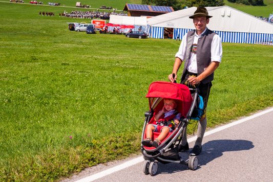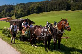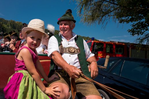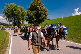 Nach dem Gottesdienst ging es wieder zurück zum Festzelt, dort gab es vielfache Gelegenheiten zu persönlichen Gesprächen und zu kulinarischen Stärkungen sowie einige Auftritte der Trachtler bei den sogenannten Ehrentänzen. Der anschließende Festzug – gegenüber dem Kirchenzug erweitert und bereichert mit Festwägen – in landschaftlicher Schönheit war ein eindrucksvolles Beispiel für ein Bilder-Buch-Bayern. Hessische Urlaubsgäste, die erstmals am Samerberg zu Gast waren und schon am Gottesdienst teilnahmen, waren mehr als begeistert, ihr Erlebnis schon während der vorangegangenen Festtage bezeichneten sie mit den Worten: „Lebensfreude, Landschaft und Leute auf dem Samerberg sind einzigartig, wir kommen bestimmt wieder“. Am nachmittäglichen Festzug durch den Ort Rossholzen und rund um die Kirche „St. Bartholomäus“ beteiligten sich rund 2.000 Trachtlerinnen, Trachtler und Blasmusikantinnen und Blasmusikanten.