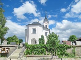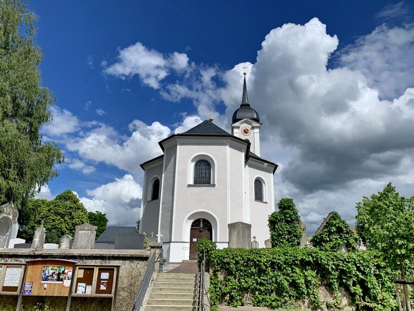 Die letzte Außenrenovierung war in den Jahren 2011-2012 nach dem schweren Unwetter am 22.06.2011 notwendig.n jeweils an der West- bzw. Ostseite. Über dem Zentralbau trohnt ein achteckiges Pyramidendach und im inneren eine Kuppel als Raumdecke. Bemerkenswert sind die übergroßen Fenster an der Süd- und Nordwand, die dem Raum eine lichtdurchflutete Leichtigkeit verleihen.