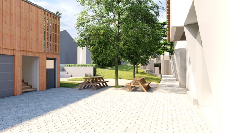 Die Architektur hat die menschliche Veranlagung, seine genetische Natur nach Gemeinsamkeit und privaten Rückzugsräumen berücksichtigt. So hat bei den Häusern jede(r) nach Südosten z. B. seine eingehauste Loggia und privaten Garten. Auf der anderen Seite gibt es einen Gemeinschaftsplatz, ähnlich wie bei einer Plaza in Italien, mit Kinderspielplatz, Sitzgelegenheiten, sowie Feuer- und Grillplatz für Erwachsene.
