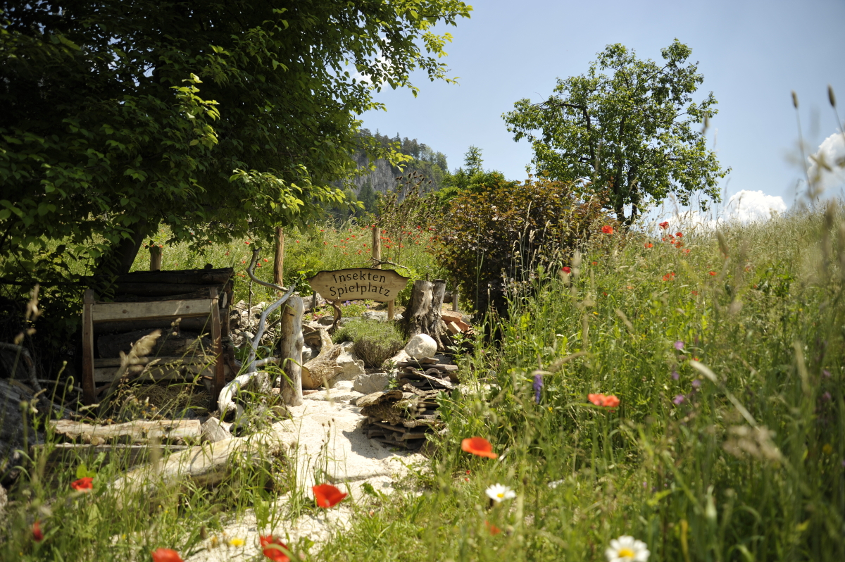 Am Insektenspielplatz finden Insekten Unterschlupf in Totholzwurzeln, Wasserstellen und spezialisierte Wildbienen können hier im offenen Sandboden brüten.