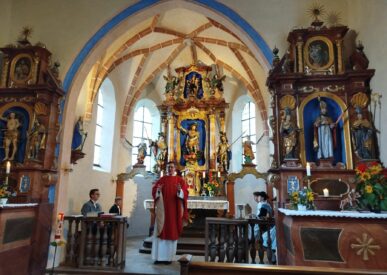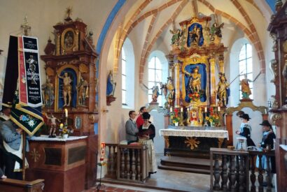 Es ist eine gute Tradition und ein echtes Bekenntnis zum Glauben, zur Heimat und zum Gedenken an die verstorbenen Mitglieder, der alljährliche Bittgang des Griesstätter Trachtenvereins, der dieses Jahr am Sonntag, den 14. September stattfand. Leider regnete es „gscheid“, als um 8 Uhr der Bittgang von Griesstätt ins 3 km entfernte Berg starten sollte. Also wurde rasch umdisponiert und ein Rosenkranz in der schönen Filialkirche in Berg gebetet. Sehr zu unserer Freude zelebrierte den anschließenden feierlichen Gottesdienst, unser neuer Pfarrer Andreas Kolb. Lesungen und Fürbitten wurden sehr gut vorgetragen von Lisa Bauer, in der feschen Röckefrautracht. Und auch der Altardienst, Buam und Dirndl waren zumeist in unserer schönen Tracht erschienen. Und natürlich auch viele von uns Teilnehmern.