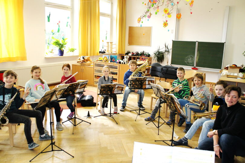 Jeden Dienstagvormittag schallt fröhliche Blasmusik aus dem Schulhaus der Wastl-Fanderl-Grundschule in Frasdorf. Eine der beiden Bläserklassen probt. Elf Kinder der dritten Klassen haben sich entschieden alternativ zum schulischen Musikunterricht an dem Angebot des Musikfördervereins der Musikkapelle Wildenwart teilzunehmen. Die jungen Musiker haben nach eifrigem Ausprobieren zum Beginn des Schuljahrs ihre Lieblingsinstrumente ausgewählt, die ihnen der Verein als Leihgabe zur Verfügung stellt. Die kleine Kapelle besteht jetzt aus Querflöten, Trompeten, Tenorhörnern, Klarinette und Saxofon.
