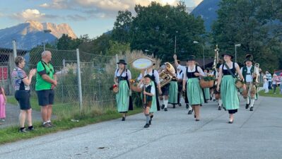 Der Abmarsch aus dem Stadion gestaltete sich auch sehr zackig, wofür die österreichischen Stabführer ja weithin bekannt sind. Die Blaskapelle Übersee-Feldwies stand dem aber in keiner Weise nach und führte im vorderen Block einen Zug mit den Kuchler Handböllerschützen an. Mit dem Regimentsgruß-Marsch am Marktplatz von Kuchl angekommen, wurde mit der Defilierung für Gastgeber und Ehrengäste die Ehrenbezeigung durchgeführt. Nach Auflösung des Zuges bezog man umgehend Quartier im Zelt und labte sich an Hendl und an einigen Halben Kaiserbier. Der Festausklang im Zelt wurde von der hervorragenden Musikkapelle Längenfeld aus dem Ötztal gestaltet. Die Tiroler hatten hochkarätige Blasorchester-Arrangements, aber auch Bierzelt-Klassiker im Programm. Bei Vogelwiese, Böhmischer Traum, aber hauptsächlich bei den österreichischen “Hymnen”, wie dem Rainer-Marsch, war die Stimmung, auch bei den Bezirkskollegen aus Teisendorf und Thundorf/Straß, am Siedepunkt angelangt.  Mit der Musikkapelle Kuchl, die größte Salzburger Musikkapelle, sind wir Überseer seit Jahren freundschaftlich verbunden. Doppelkonzerte und gegenseitige Besuche bezeugen dies. Bei diesem feierlichen Anlass überreichten Überseer Dirigent und Vorstände einen Holzbanz’n Augustinerbier als Gastgeschenk und luden die Obmänner, die Kapelle und die Festgesellschaft zum Musikfest 2025 nach Übersee ein. Einige Kuchler Vereine werden wohl dieser Einladung auch folgen – freut euch auf ein buntes Musikfest im Juli 2025!