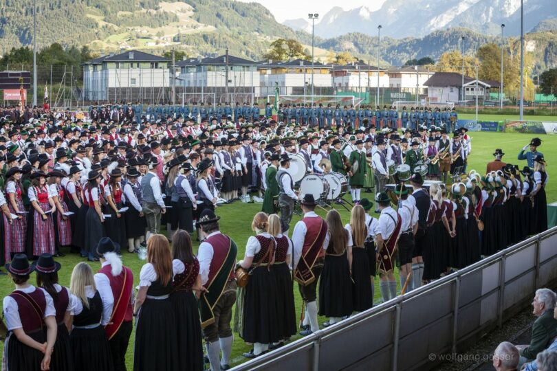 Am Festplatz angekommen wurde zunächst die Labstation (Verpflegung mit Kaiserbier und Fleischkässemmeln) hinter der Haupttribüne am Kuchler Fußballstadion, direkt an der Salzach, aufgesucht. Nachdem hier nach und nach alle Gastkapellen, aus ganz Österreich und aus Bayern, eingetroffen waren, begann die Aufstellung zum Festakt. Registerweise nahmen die rund 500 Musikanten vor der Tribüne Aufstellung – nach der Ansprache des Bürgermeisters, wurde der Kommandant des Schützenkorps Kuchl, eine Traditionsformation in Kaiserjäger-Adjustierung, beauftragt, den Vereinsobmann den Festakt beginnen zu lassen. Bestätigend erwiderte dieser “Jawoll, mit dem Festakt beginnen!“ – zackig ging es dann, für uns ungewohnt, weiter: 500 Musikantinnen und Musikanten wurden mit “das Ganze, hab Acht” in Stellung gerufen – “das Ganze ruht” beendete den militärisch-angehauchten Teil und der Kuchler Kapellmeister leitete das Gesamtspiel ein. Speziell arrangierte Kirchenstücke, gespielt von einem riesigen Orchester, sorgten für Gänsehautstimmung. Nachdem der Ortspfarrer den kurzweiligen Wortgottesdienst beendet hatte, erklang noch der Schönfeld-Marsch von Carl Zierer, damaliger Kapellmeister der Hoch- und Deutschmeister.