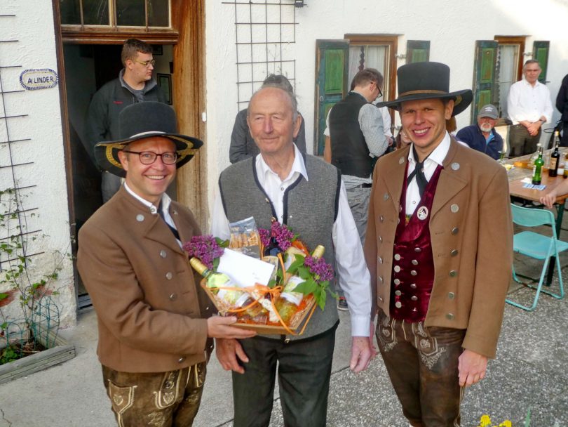Seinen 85. Geburtstag konnte Andreas Linder, Venis-Austragsbauer von Grainbach am Samerberg feiern. Vor und in seinem Haus fanden sich dazu zahlreiche Gratulanten ein, um dem Venis-Anderl zu gratulieren und ihm für seine gegenüber der Allgemeinheit recht aufgeschlossene Art zu danken. Besondere Freude beim Jubilar erweckte ein Ständchen der in großer Besetzung gekommenen Samerberger Musikkapelle. Ganze 50 Jahre gehörte Linder der Musikkapelle als B- und Es-Klarinettist sowie mit dem Tenor-Saxophon an, über 50 Jahre war er auch aktives Mitglied im Samerberger Kirchenchor. Musikvorstand Christian Leitner und Dirigent Benedikt Paul bedankten sich zusätzlich zum musikalischen Gruß mit einem Präsentkorb für die lange Musikanten-Treue. Nächster Gratulant war der Trachtenverein Hochries-Samerberg, dessen Vorstand Peter Sattlberger dem über die Gemeindegrenzen hinaus bekannten Rechenmacher für dessen Mitwirken bei Festwägen, Theateraufführungen und Freilichtspielen „Vergelt´s Gott“ sagte.
