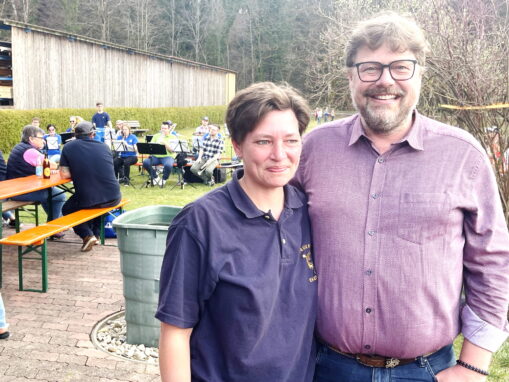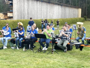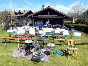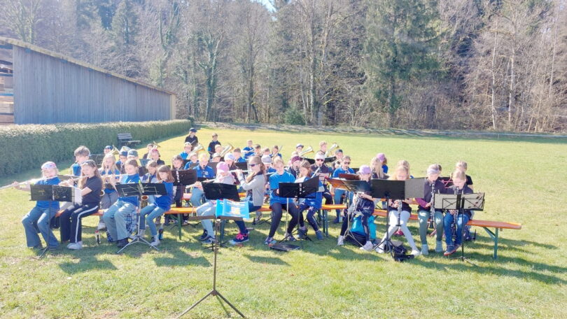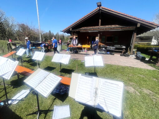 Bestes Frühjahrs- und Sonnenwetter ermöglichte es, dass ohne Zeltaufbau im Freien sowie mit Versorgung aus der Vereinshütte und mit einem Grill ein komplettes Tagesprogramm gestaltet werden konnte. Für die Zwergerl-Musikanten aus den Reihen der Blaskapelle Wildenwart und der Musikkapelle Eggstätt war der Tag geprägt vom gegenseitigen Kennenlernen, von gemeinsamen Spielen sowie von musikalischen Aktivitäten. Unter der Leitung von Eva-Maria Gruber wurden unter anderem die Stücke „Forrest Gump“, „Pirates of the caribbean“, „Hans bleib do!“ oder die „Sternpolka“ einstudiert. Als zum Nachmittag auch noch Mitglieder der beiden Erwachsenenkapellen dazu kamen, wurde noch in einem großen Miteinander die Bayernhymne gespielt. Für die Eltern des Blasmusiknachwuchses war es eine sichtbare Freude, mit welchem Eifer und Begeisterung die Dirndl und Buam am Werke waren. Unter den dankbaren Gästen und Zuhörern waren auch Erster Bürgermeister Christoph Kraus aus Eggstätt, die Vorstände Sebastian Aiblinger und Annemarie Blank vom Musikverein Eggstätt sowie Ehrenvorstand Jakob Steiner Erster Vorstand Andreas Willmann und Zweiter Vorstand Andreas Stoib vom Musikförderverein Wildenwart.