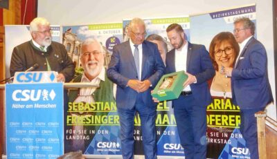 Den abschließenden Dank an alle Beteiligten und insbesondere an den Bayerischen Innenminister sagte CSU-Kreisvorsitzender Klaus Stöttner, dieser bedankte sich bei den vielen Blaulicht-Organisationen für das gute Miteinander in seinen 20 Landtagsjahren, in denen sich die bayerische Bevölkerung von 11,5 Millionen auf 13,5 Millionen Einwohner erhöht hat. An Innenminister Joachim Herrmann überreichte er zusammen mit Sebastian Friesinger und Daniel Artmann eine Genusskiste der Rosenheimer Regionalvermarktung. Ein abschließender Dank galt Wirt Lenz vom Gasthof Hirzinger und seinem Team sowie für Maria Rothmayer aus Söllhuben mit Gitarre und Maria Grimm aus Bernau mit Ziach für deren musikalische Ausgestaltung.