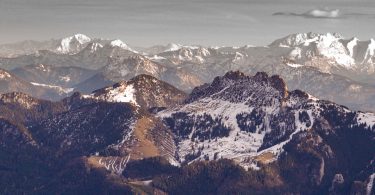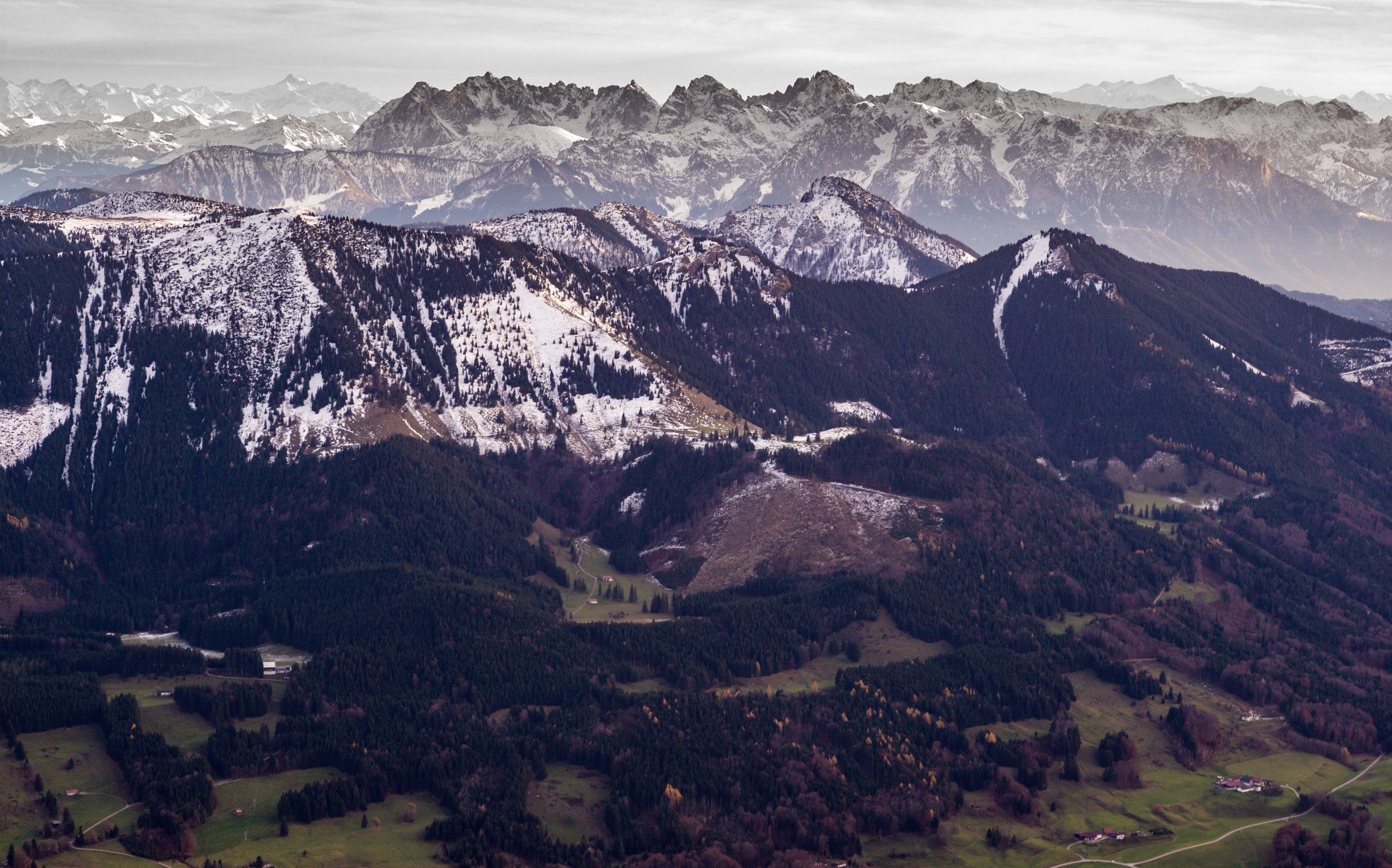 Noch nicht richtig Winter, aber auch schon den Abschied vom Herbst verspürend – dies und natürlich die eindrucksvolle Bergkulisse im Norden der Alpen zeigt diese aktuelle Aufnahme über dem Samerberg mit Blick über Hochries, Karkopf und Feichteck.