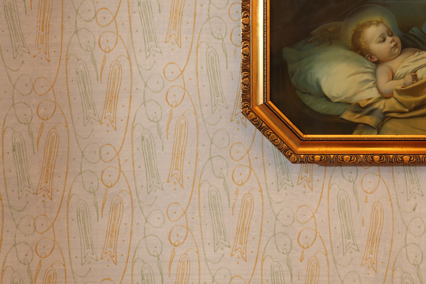 Der Ausschnitt macht das Bild! Mit dem angeschnittenen Wandbild bekommt das historische Walzenmuster der Wanddekoration eine ganz neue Wirkung. © Bezirk Oberbayern, Archiv BHM, Aufnahme: Gerhard Nixdorf.