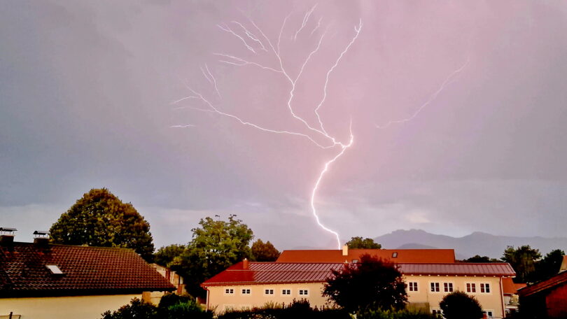 Diesen Moment eines Blitz-Niederganges hielt am Abend des Geburts- und Namensfestes von König Ludwig II im Priener Ortsteil Bachham unser Fotograf fest. Es zeigt die weitverzweigte Struktur des Naturphänomens beim Eintreten in die Erde und es vermittelt den Eindruck, dass der Blitz direkt die Häuser trifft.