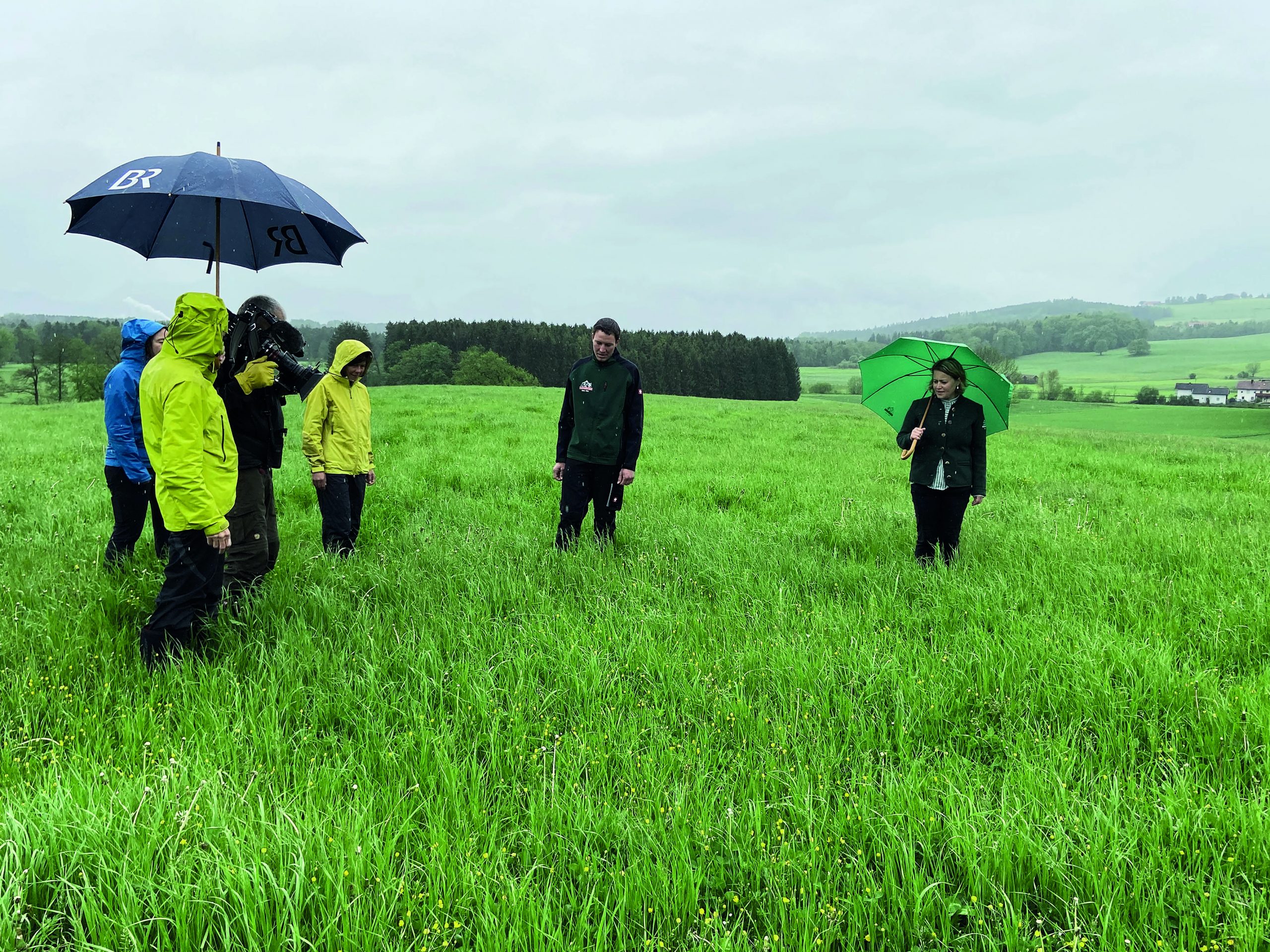 Bei Regenwetter begleitete ein Filmteam für die Sendung „W wie Wissen“ das Fachgespräch zwischen Landwirt Johannes Egger (2.v rechts), Landschaftsökologin der Biosphäre BGL Sabine Pinterits (3. von rechts) und Sylvia Schindecker, Leiterin Abteilung Landwirtschaft bei der Molkerei Berchtesgadener Land (rechts) zur Anreicherung mit Gräsern und Kräutern seiner neu gepachteten Wiese.