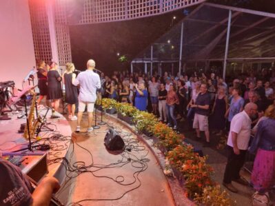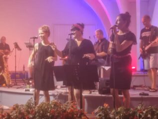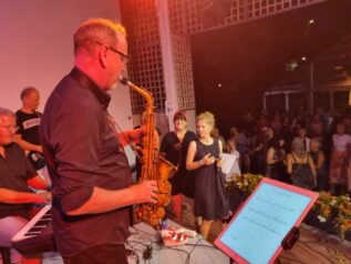 Sängerinnen und Sänger, vier Bläser und Rhythmussektion präsentierten bekannte Kult-Klassiker von den Blues Brothers, Earth, Wind and Fire, Stevie Wonder. Auch neuere Songs von Robbie Willimas, Amy Winehouse oder Bruno Mars waren im Programm. Der Brunnenhof war voll besetzt, es dauerte nicht lange bis es die Leute nicht mehr auf den Plätzen hielt und sie tanzten begeistert.