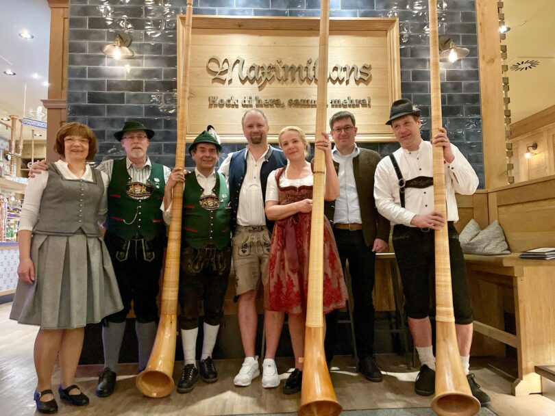 Bis auf den letzten Platz war das Maximilians im Herzen von Berlin ausgebucht. Punkt 19:00 Uhr hieß es dann „O’zapft is“. Mit einem Schlag wurde vom Oberkellner Martin das erste Holzfass des hochprozentigen Gerstensaftes „angestochen“. Das „D’Otreiber-Duo“ Siegi und Peter, vom Verein der Bayern in Berlin, sorgte für die musikalische Umrahmung des Abends. Dazu gab es alpine Einlagen vom Berliner Alphorn-Trio „Alphorn Bavaria Berlin“. Höhepunkt war der „Watschenplattler“ vom Plattler-Duo Lutz und Ralf, ebenfalls vom Verein der Bayern in Berlin.