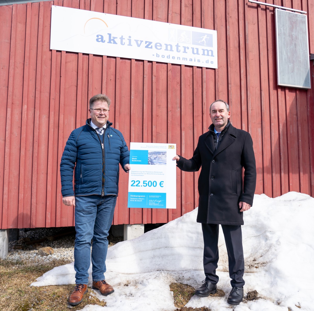 Wirtschaftsminister Hubert Aiwanger übergibt die Förderurkunde an Joli Haller (1. Bürgermeister des Marktes Bodenmais). Foto: StMWi/Elke Neureuther