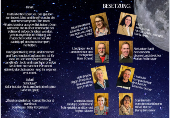 Im Dusterhof, der schon seit langem leer steht, soll es unheimlich sein…es soll sogar spuken. Giggi (Maria Hirthe) und Mina (Maria Stadler) – zwei Freundinnen haben dort nun eine Wunschzettel – Geisterbeschwörung geplant. Giggi, die weder zu Schnupftabakt noch zu Schnaps “nein” sagt, und ihre Freundin Mina (Maria Stadler) veranstalten eine turbulente Wunschzettelaktion. Denn Wünsche, die in einer Rauhnacht bei Vollmond aufgeschrieben werden, gehen angeblich in Erfüllung. So manche Dorfbewohner wie Braumeister Beppo (Bert Furtner), die Sonnhoferin (Maria Ruhsamer), den naiven Tschacko (Thomas Furtner) und die verkopfte Dorflehrerin Adelheid Amsel (Regina Häusler) treibts in das gespensterliche Anwesen. Für ein Durcheinander sorgen auch die plötzlich auftauchenden Landstreicher, Langfinger-Jockl (Hans Schmid) und sein Sohn Abstauber-Bartl (Florian Rothmayer).