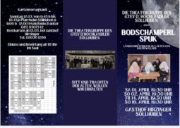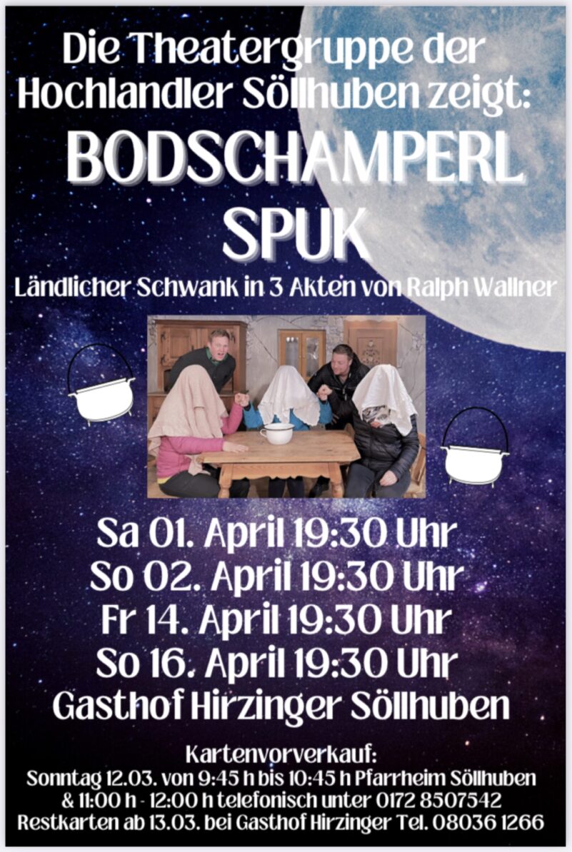 Die Theatervorbereitungen in Söllhuben laufen bereits auf Hochtouren. Für alle Theaterbegeisterten haben die Söllhubener Spielleiter des Trachtenvereins, Konrad Fischer und Martin Alt wieder ein besonderes Schmankerl ausgewählt. Beim “Bodschamperlspuk” von Ralph Wallner gibts wieder allerhand zum lachen.