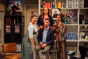 Szenenbild “Der Beste für die Besten”. Von links: Chakira v. Eichenlohe (Kirstin Rokita), Adam Baumer (Philipp W. Wilhelm), die Provinzbaronin Galetta Gräfin v. Unnütz (Marion Schieder) und hinten die Gattin des OB Kandidaten Galetta Gräfin v. Unnütz (Marget Flach).