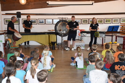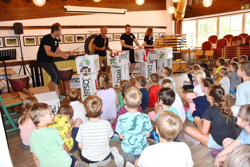 Die Schüler in Schleching hatten Glück dabei zu sein, bei der Schultour des Symphonieorchesters des Bayerischen Rundfunks durch bayerische Grundschulen. Eine Flötistin (Nathalie Schwaabe) und drei Schlagzeugspieler (Guido Marggrander, Christian Pilz und Jürgen Leitner) besuchten in einer Woche acht Grundschulen unter dem Motto „Kartons und Querflöte“ – BRSO und du“ ein interaktives Kinderkonzert.