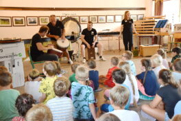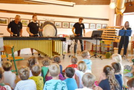 Die Musiker zeigten noch, wie sie ihre Pause machen, essen und mit Holz-Kochlöffeln einen mitreißenden Sound auf dem Tisch und in der Luft produzieren. Zum Schluss wurden die Instrumente vorgestellt, Leopold erkannte das silberne Xylophone, Maxi das 40 Kilogramm schwere Marimbaphon und Felix die Querflöte, aber Annalena wusste, dass es eine Piccolo Flöte war. Zum Schluss dankte Schüler Elias den Musikern für die tolle Stunde und Christoph hatte ein kleines Geschenk für sie.