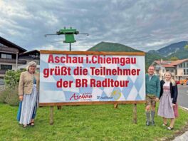 Die Gemeinde und Tourist Info hat extra einen großen Begrüßungsbanner in den Kreisverkehr stellen lassen, um den Fahrradfahrern ein Zeichen der Gastfreundschaft zu zeigen. Aschaus Dritte Bürgermeisterin Monika Schmid hat zusammen mit Aschaus Tourismuschef Herbert Reiter, Anna Lampersberger von der Tourist Info und mehreren Gemeinderäten und Bürgen die Tour-Teilnehmer begrüßt. Weiter ging es dann direkt auf der Staatsstraße in Richtung Bernau zum nächsten Zwischenstopp.