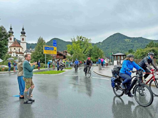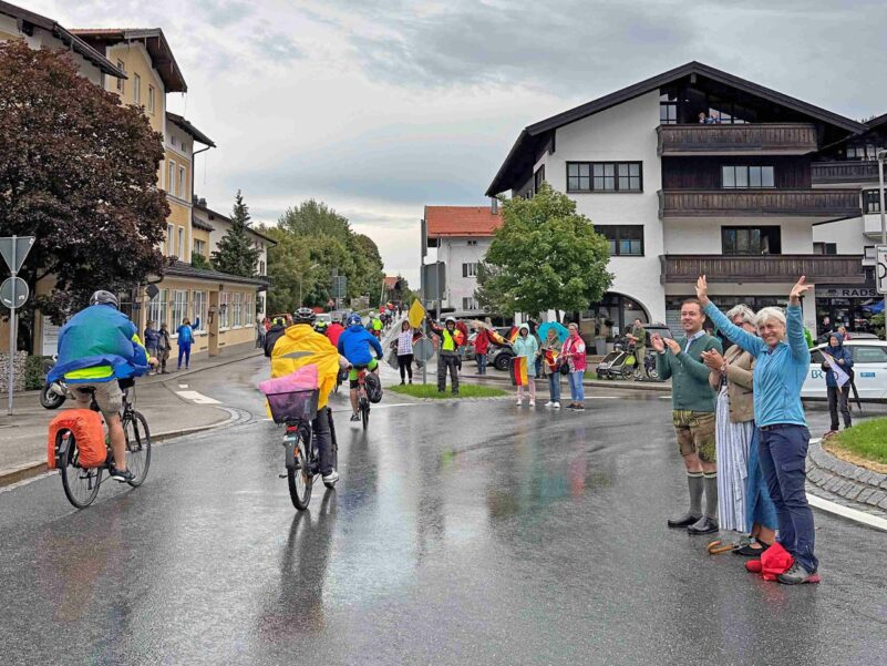 Da staunten die mehreren tausend Teilnehmer der BR-Radltour nicht schlecht, als diese mit Fähnchen bestückt und Jubelrufen am Fuße der Kampenwand in Aschau i.Chiemgau begrüßt wurden.