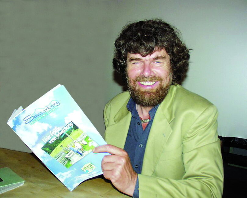 Archiv-Foto: Hötzelsperger (2005 in Aschau i. Chiemgau – Reinhold Messner mit Prospekt Samerberg)