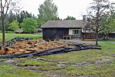 Im Freilichtmuseum Glentleiten des Bezirks Oberbayern kam es am gestrigen Sonntag, 15.8., durch Blitzeinschlag zum Brand eines historischen Stadels. Personen wurden nicht verletzt. Die über 100 Jahre alte Streuhütte gehörte zu einem Kleinanwesen aus Kerschlach (Gemeinde Pähl, Landkreis Weilheim-Schongau) und bildete mit diesem zusammen ein Gebäudeensemble. Der Stadel, in dem – wie ehemals üblich – Heu untergebracht war, brannte komplett nieder. Durch den schnellen und tatkräftigen Einsatz der Feuerwehren der Gemeinden Großweil, Schlehdorf, Sindelsdorf, Kochel und Murnau, die von der Glentleitner Betriebsfeuerwehr informiert wurden, konnte der Brand eingedämmt werden, sodass das angrenzende Kleinanwesen nur im Bereich des Wirtschaftsteils leicht in Mitleidenschaft gezogen wurde. Trotz des Brandes ist das Freilichtmuseum geöffnet – derzeit täglich von 10:00 bis 17:00 Uhr.