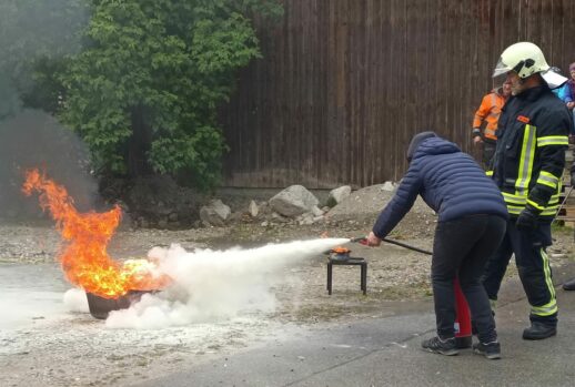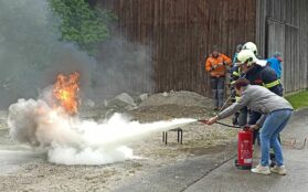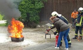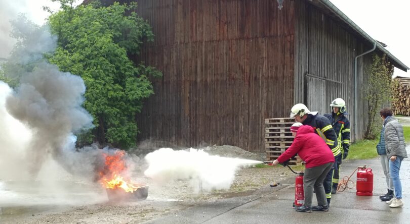 Was tun, wenn’s brennt? Die Wildenwarter Frauen wissen jetzt Bescheid! Kommandant Florian Fischer und Vorstand Georg Loferer mit ihren Männern zeigte allen, wie man einen Feuerlöscher richtig bedient. Über 30 Frauen fanden sich im Wildenwarter Feuerwehrhaus ein, um sich über die Gefahren des Feuers und Unfälle im Haushalt zu unterrichten. Alle, die mitmachen wollten, durften einen Kleinbrand mit dem Pulverlöscher ablöschen. „Eigentlich ganz einfach, wenn man es einmal gemacht hat“, meinten die Wildenwarterinnen zu der Vorführung.