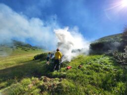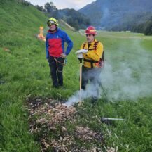 „Jedes Feuer fängt klein an – ein kleines Feuer lässt sich noch mit den einfachsten Mitteln bekämpfen, man muss nur wissen wie es geht“, erklärte Lindon Pronto vom „Europäischen Forst Institut” (efi) in Bonn auf der Oberkaser-Alm droben am Geigelstein den Männern und Frauen von den benachbarten Almen, den Männern der Bergwacht und den Führungskräften der Feuerwehr.