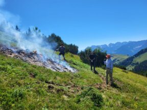 Die Almbauern kamen auf die Sulzing Alm zum Schwenden, also zum Entbuschen der Weideflächen. Schließlich sollen die Almflächen erhalten bleiben – wohin aber mit dem gerodeten Material? Seit altersher werden Äste, Zweige und Gestrüpp zu großen Haufen zusammengetragen und auf freiem Feld angezündet. Unter Aufsicht verbrennen diese Daxenhaufen und am Abend zeugt nur noch eine schwarze Stelle auf der Alm von dem Feuer tagsüber. Pronto führte den Almleuten vor, wie man eine solche Feuerstelle vorbereiten kann, wie ein Überspringen der Flammen auf den Almboden mit einfachen Maßnahmen verhindert werden kann und damit die Entstehung eines Flächen- oder Waldbrandes am Berg. Und sollte doch einmal etwas außer Kontrolle geraten: „Es ist wichtig, bei einem Kleinbrand oder einem Entstehungsbrand im Gelände so schnell wie möglich zu handeln und mit den Löscharbeiten zu beginnen. Rucksackspritze und Feuerpatsche tun hier gute Dienste. Damit lässt sich Zeit gewinnen, bis jemand kommt, der es besser kann und der besser für den Kampf gegen das Feuer ausgerüstet ist, sei es ein geländegängiges Löschfahrzeug oder ein Hubschrauber“. Lindon Pronto weiß wovon er spricht, er war sieben Jahre für die kalifornische Forstbehörde als Firefighter in brennenden Wäldern unterwegs und später lange Zeit als Berater bei Waldbränden in der halben Welt tätig. Jetzt organisiert er in einem vom Bund geförderten Projekt den internationalen Wissensaustausch über Waldbrände („Waldbrand-Klima-Resilienz“ kurz WKR), vermittelt theoretisches Wissen über den Gebrauch des Feuers und bildet Ersthelfer und Einsatzkräfte im Umgang mit Kleinlöschgeräten aus. Da er seit einiger Zeit in Sachrang wohnt, kümmerte er sich so ganz nebenbei um die Entstehung und Bekämpfung von Waldbränden auf den Bergen im Chiemgau. Die allerersten Einsatzkräfte im Gebirge sind die Almbauern oder Hüttenwirte, die entstehende Brände unter Kontrolle halten sollen, bis die Einsatzkräfte der Feuerwehren mit schwerem Gerät heran sind. „Wir können ein Feuer nicht einfach einmal brennen lassen und darauf hoffen, dass es irgendwann von selbst ausgeht. Wir haben vergessen, wie man mit Feuer umgeht”, sagt Pronto. „Der fortschreitende Klimawandel, Hitzewellen, wochenlange Dürreperioden, extreme Wetterlagen – all das lässt die Waldbrandgefahr steigen“. Das Europäische Forstinstitut hat den Chiemgau als Demonstrationsregion für die Waldbrandbekämpfung im Gebirge ausgesucht, sagt Lindon Pronto, zu den Kooperationspartnern zählen neben den Feuerwehren auch die Bergwacht sowie die vom Freistaat zum Kompetenzzentrum für Waldbrandbekämpfung erklärte Feuerwehrschule in Regensburg und die dortige Technische Hochschule.