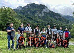 Beim Bergwachtfest in Aschau übergab Lindon Pronto vom „Europäischen Forst Institut” (efi) in Bonn mehrere Feuerbekämpfungsausrüstungen an die Almbauern im Oberen Priental. (von Links) Tobias Brinkmann, Feuerwehrkommandant Aschau – Lindon Pronto, Waldbrandexperte aus Innerwald mit Sohn Sage – Max Pfaffinger jr., Ausserwald, Almbauer am Spitzstein, Auer- und Tristmalnalm – Wast Pertl, Innerwald, Almbauer am Geigelstein, Sulzingalm – Martina Bauer, Stein, Sennerin auf der Kampenwand, Steinlingalm – Bürgermeister Simon Frank – Andreas Schmid, Aschau, Almbauer auf der Elandalm – Stefan Singhartinger, Feuerwehrkommandant Sachrang – Thomas Riepertinger, Bereitschaftsleiter Bergwachtbereitschaft Sachrang-Aschau.